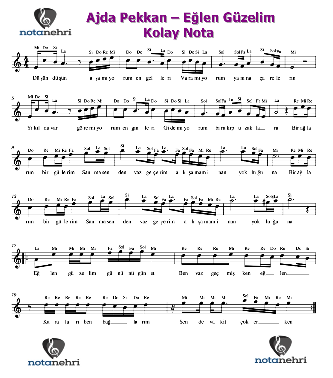 Bu yazımızda Ajda Pekkan‘ın seslendirdiği Eğlen Güzelim şarkısının kolay notasını paylaştık. Şarkının söz ve müziği Eda ve Metin Özülkü çiftine aittir.Notasyonu la minör yorumlanmış olan bu şarkının kolay piyano notasını ve do,re,mi notasını aynı tonda paylaştık. Resim dosyalarının altında PDF dosyasını da ekledik. Bilgisayarına indirip kaydedebilirsiniz. Keman, flüt, org, melodika notalarını basit şekilde çalabilmeniz için ekledik. Bütün enstrümanlar için ortak notadır.