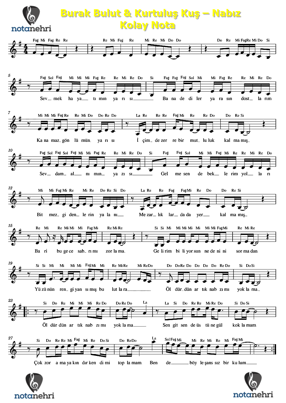Bu yazımızda Burak Bulut ve Kurtuluş Kuş‘un seslendirdiği Nabız şarkısının kolay nota ve piyano notalarını paylaştık. Şarkının söz ve müziği Burak Bulut, Kurtuluş Kuş ve Aykut Açık‘a aittir. Kürdi dizisi üzerine yazılmış bir şarkıdır. Notasyonları si karar tonda paylaştık. Resim dosyalarının altında PDF dosyasını da ekledik. Bilgisayarına indirip kaydedebilirsiniz. Keman, flüt, org, melodika notalarını basit şekilde çalabilmeniz için ekledik. Bütün enstrümanlar için ortak notadır. Piyano düzenlemesinde iki sesli akor eşlikli şeklinde hazırladık.