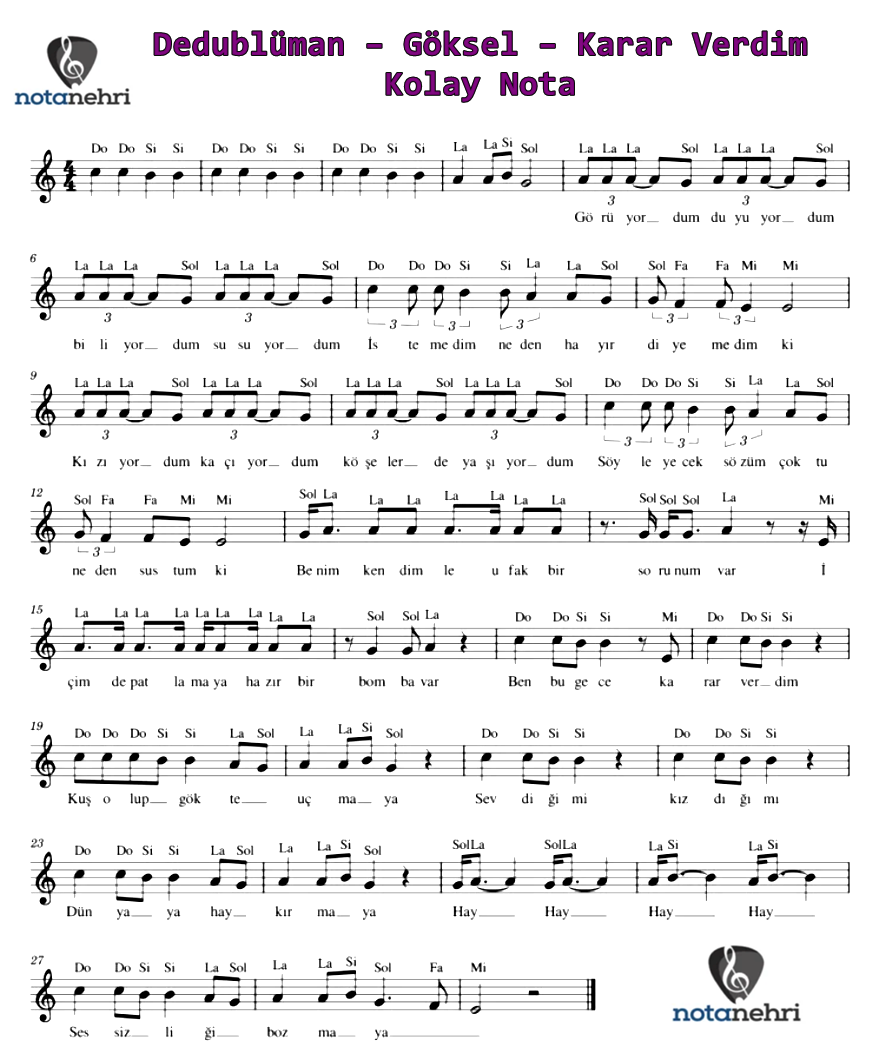 Bu yazımızda Dedublüman ve Göksel‘in seslendirdiği Karar Verdim şarkısının kolay notasını paylaştık. Şarkının söz ve müziği Göksel‘e aittir. Şarkıyı beraber seslendirmişlerdir. Şarkının notasyonu fa karar tonda paylaşılmış, biz la karar tonda paylaştık. Resim dosyalarının altında PDF dosyasını da ekledik. Bilgisayarına indirip kaydedebilirsiniz. Keman, flüt, piyano, org, melodika notalarını basit şekilde çalabilmeniz için ekledik. Bütün enstrümanlar için ortak notadır.