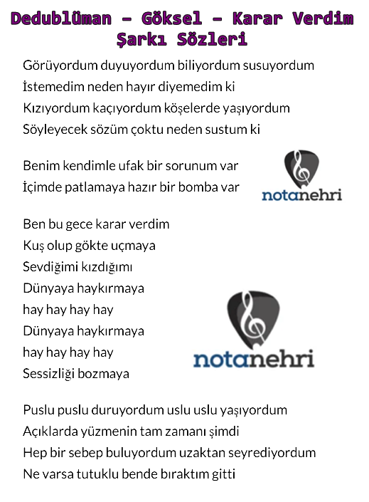 Dedublüman – Göksel – Karar Verdim Şarkı Sözleri PDF Dosyası