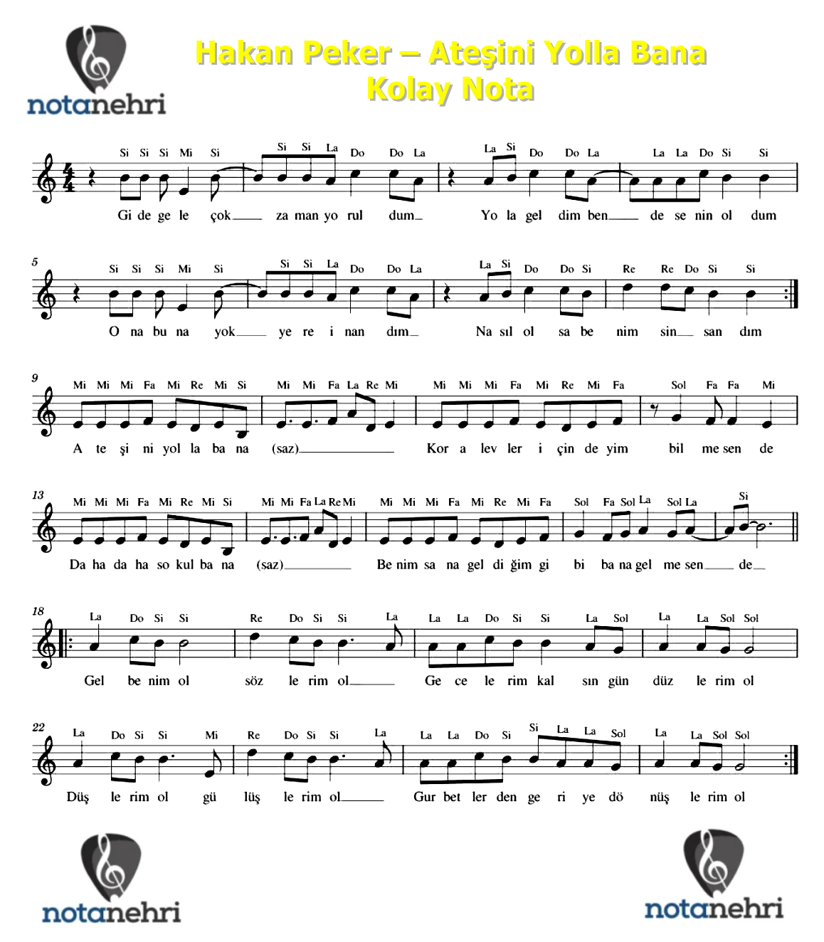 Bu yazımızda Hakan Peker‘in sevilen Ateşini Yolla Bana şarkısının do,re,mi ve kolay piyano notalarını paylaştık....