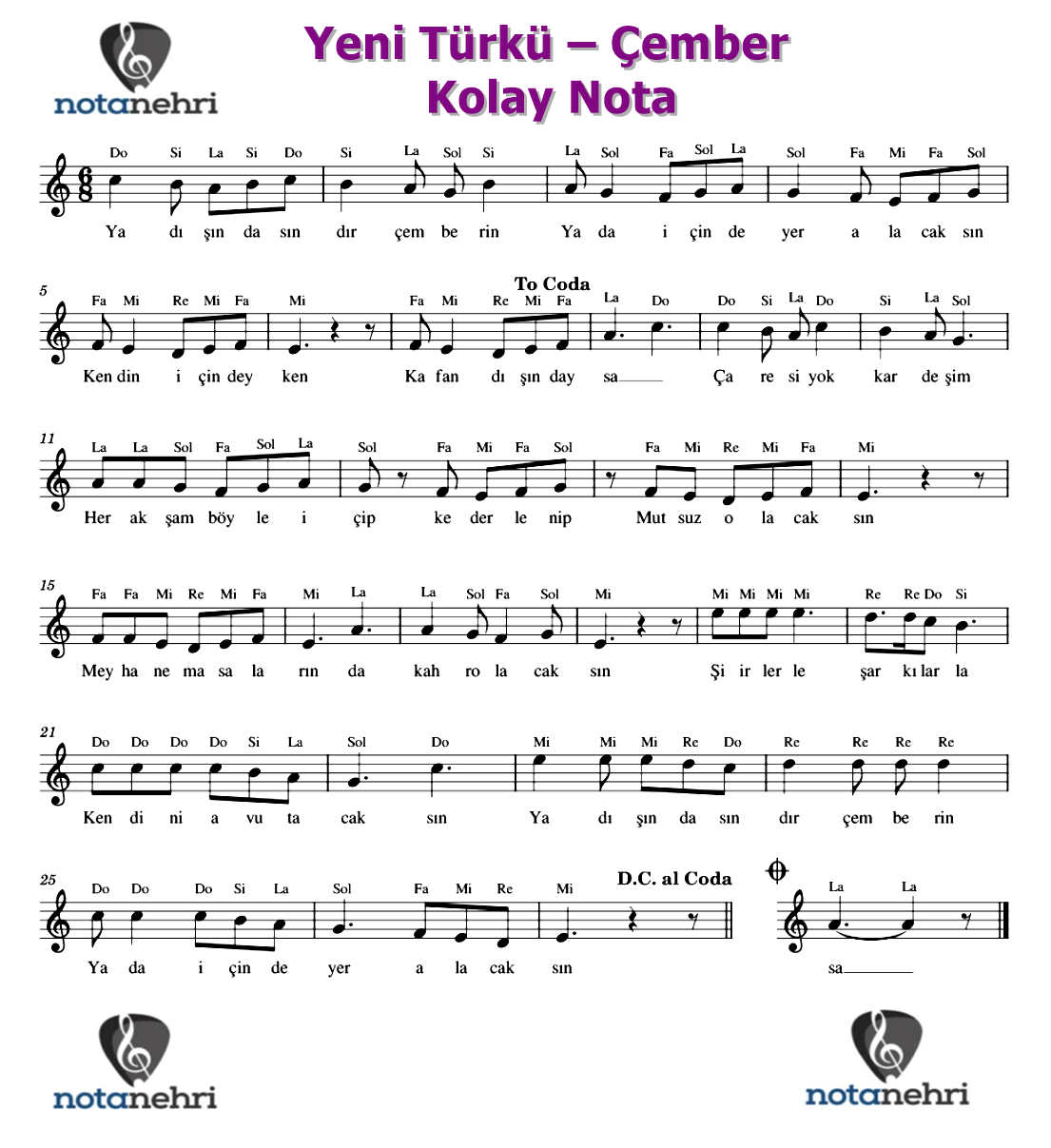 Bu yazımızda Yeni Türkü‘nün seslendirdiği Çember şarkısının kolay notasını paylaştık. Şarkının bestesi Selim Atakan‘a ve sözleri Murathan Mungan‘a aittir. Notasyonu sol karar yorumlanmış olan bu şarkının notasını la karar tonda paylaştık. Resim dosyalarının altında PDF dosyasını da ekledik. Bilgisayarına indirip kaydedebilirsiniz. Keman, flüt, org, melodika notalarını basit şekilde çalabilmeniz için ekledik. Bütün enstrümanlar için ortak notadır.